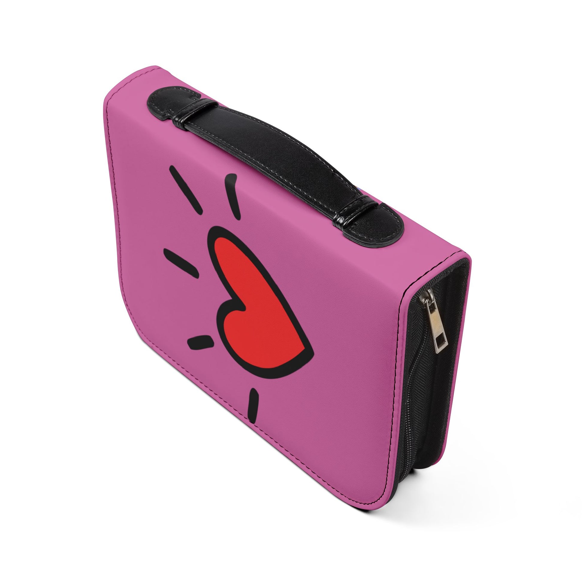 Soft to the touch yet durable, this PU leather Bible cover wraps your Scripture in warmth and style. The cozy pink exterior and gentle illustration — a blanket-wrapped figure beside a glowing fireplace with a stack of books and a steaming cup — create a quiet scene of rest and devotion. Zipper closure and internal compartments keep your Bible, notes, pens, and small keepsakes organized and within reach. A black handle and stitched trim add contrast and easy portability. Sizes available to fit most Bibles; choose one size up if you prefer extra room. This cover brings a calm, reflective presence to study time, church gatherings, or quiet evenings at home.
